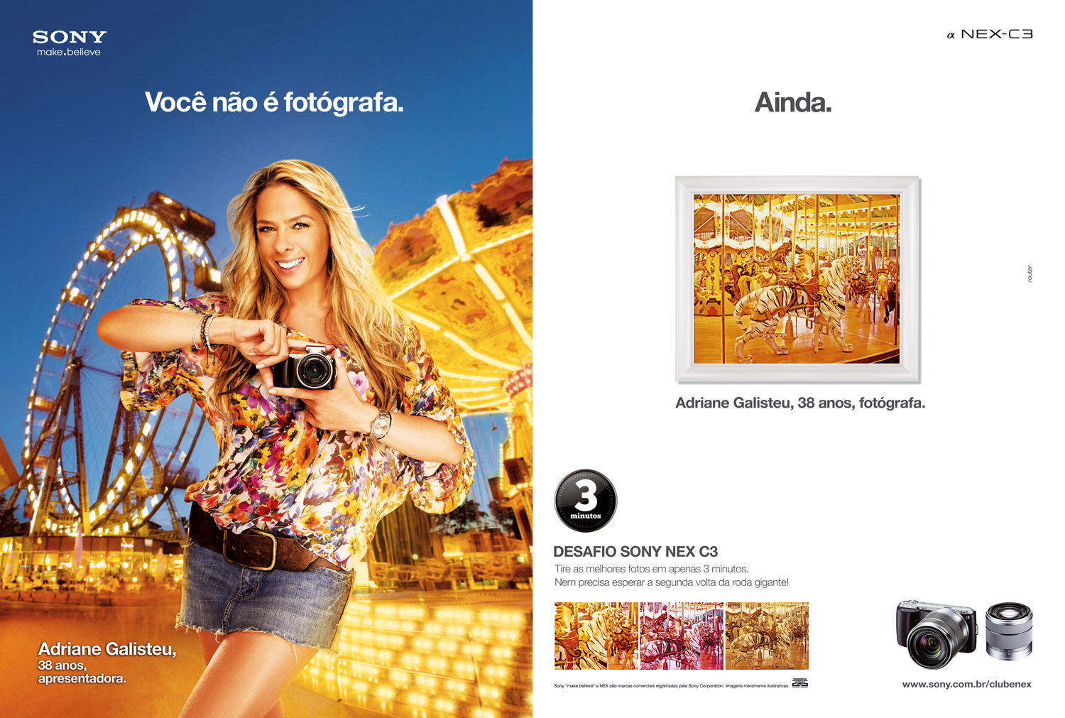 Para dar legitimação ao conceito “Você não é fotógrafo. Ainda.”, realizamos exposições com fotos de celebridades e formadores de opinião que não eram fotógrafos profissionais, mas que fizeram belos trabalhos com os recursos da NEX-C3. Para provar o conceito na prática, realizamos blitze em locais de grande movimentação em seis estados do Brasil. Os promotores lançavam o “Desafio Sony NEX-C3” aos consumidores, que consistia em tirar uma foto com efeitos e qualidade igual à exibida pelo promotor em apenas 3 minutos.